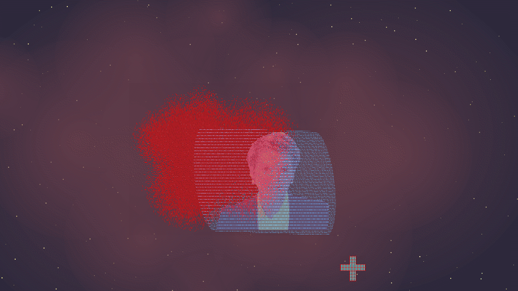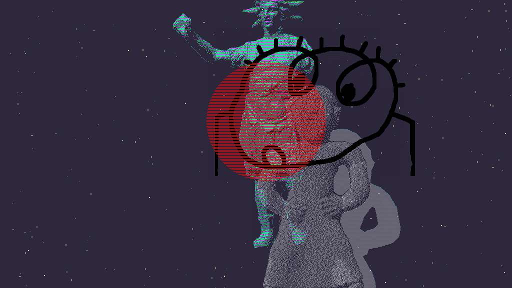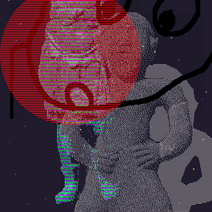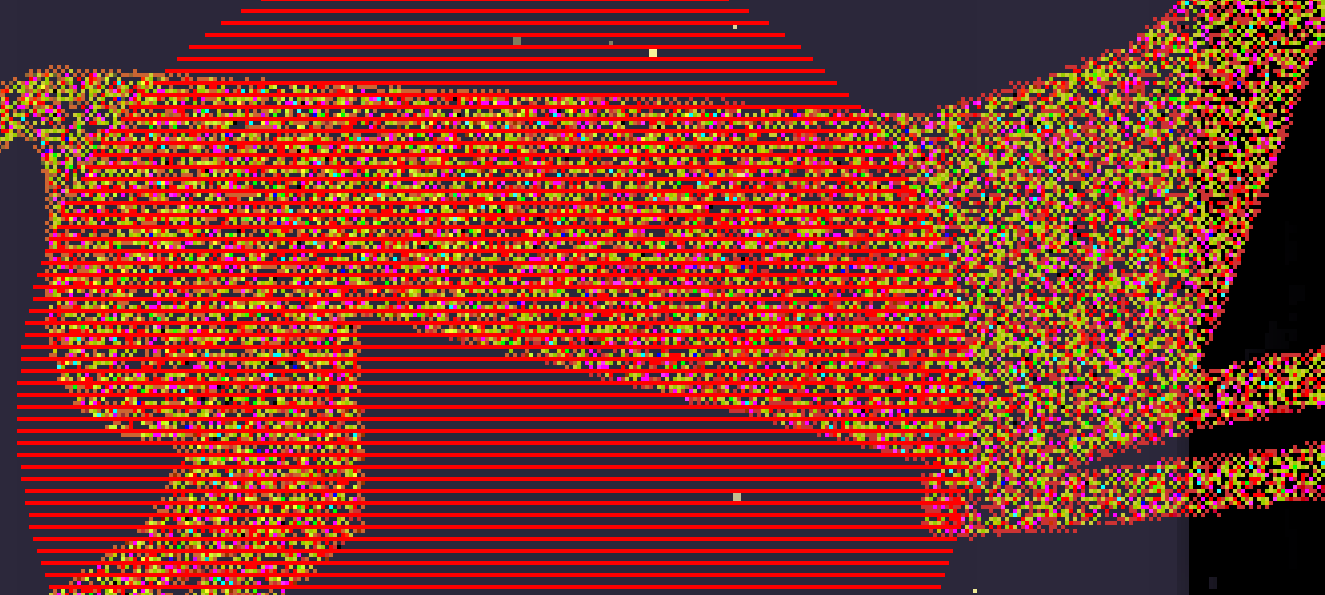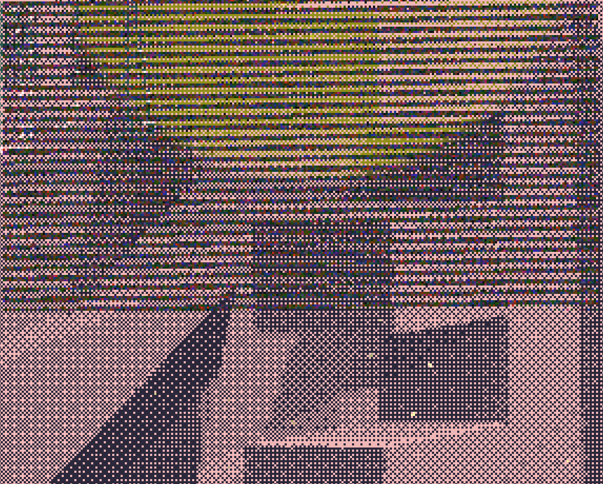 La compression de l'image video nuit au travail de la matière des pixels et des trames,[voir],[voir],[voir]. Ces éléments, dans une video, sont "brouillés" par la nature élastique et la compression de l'image video; mais, en contrepartie, le rythme est perceptible. La video étant un enregistrement, elle se répète. Le programme, lui, crée des combinaisons à l'infini.